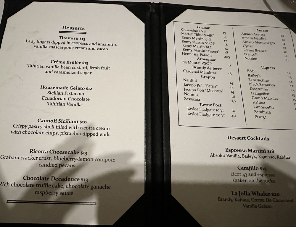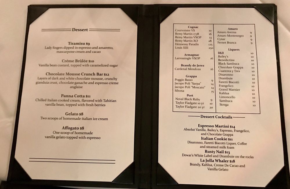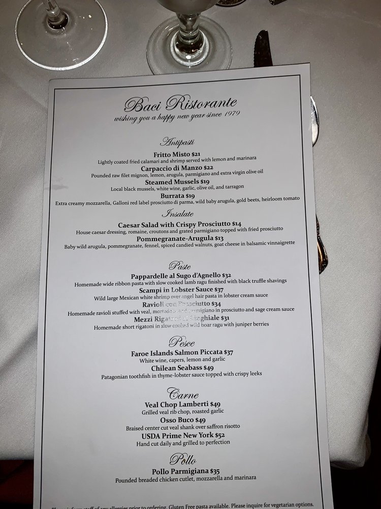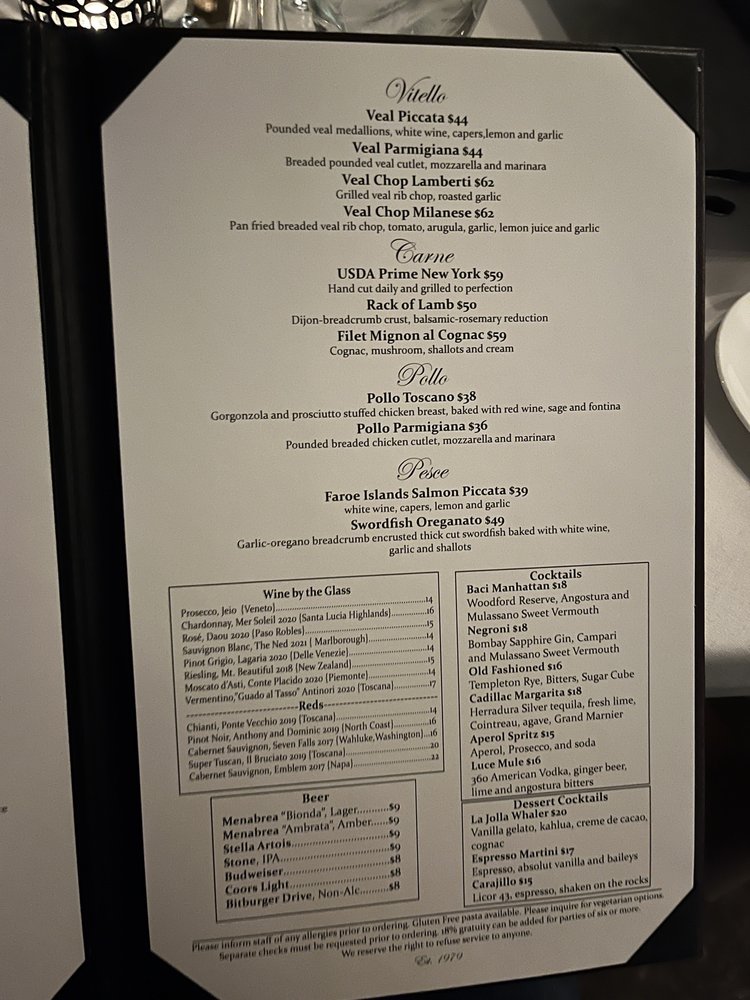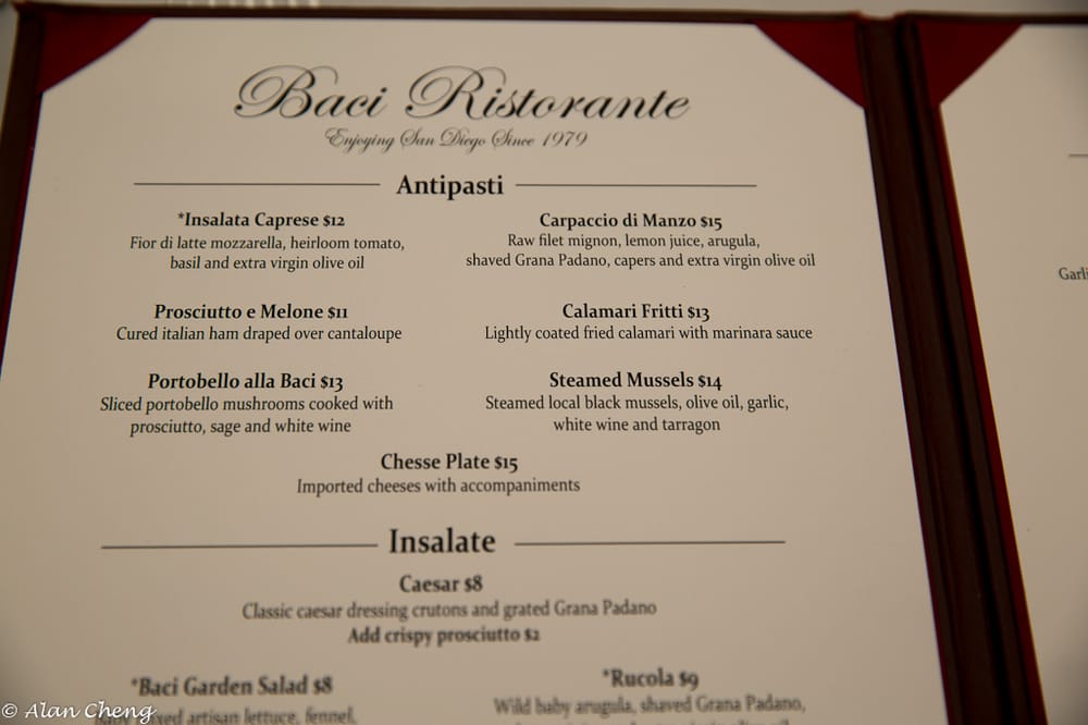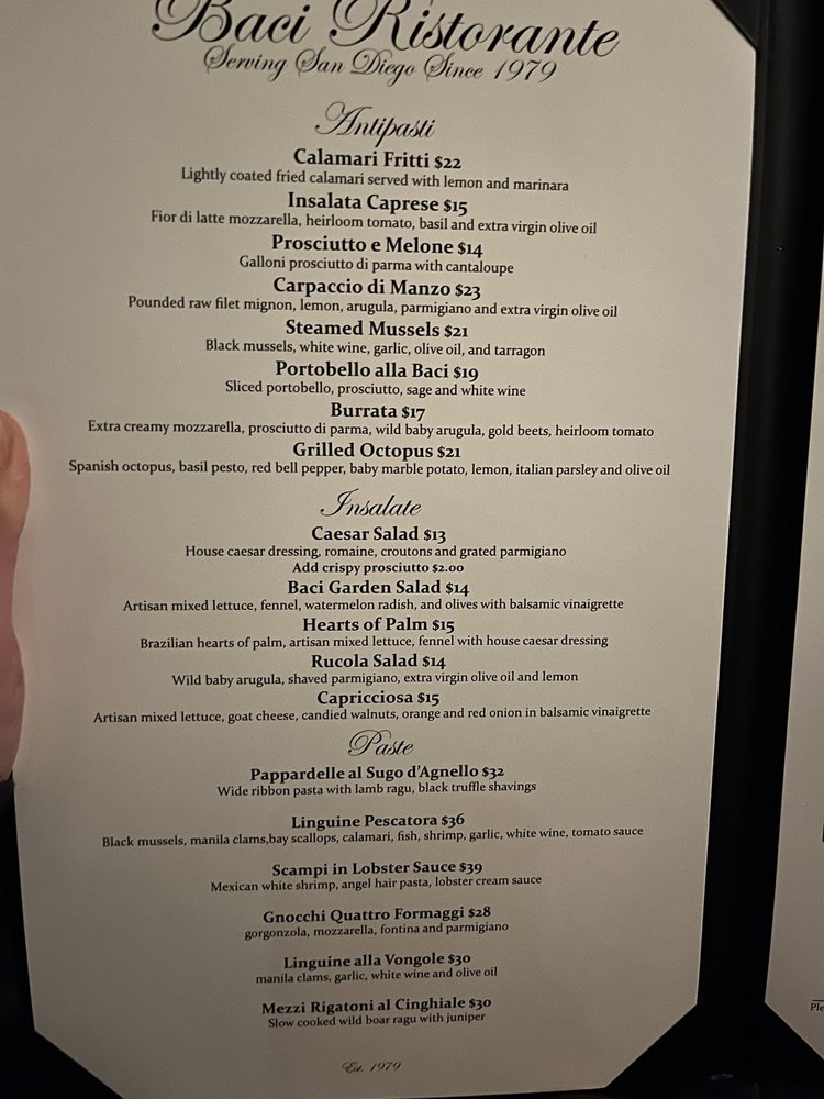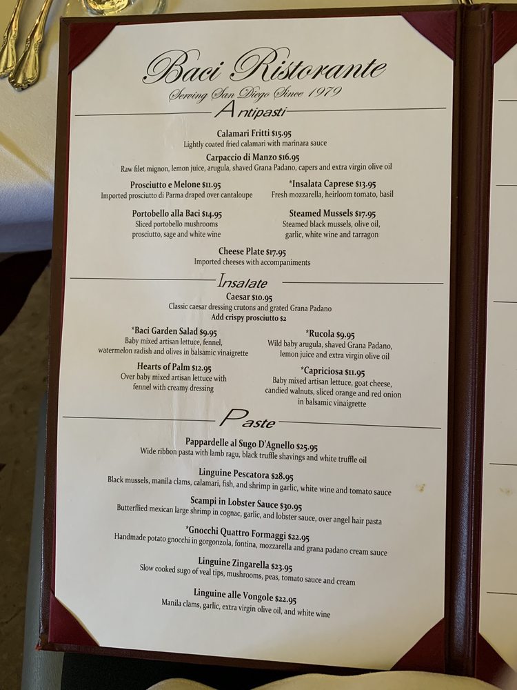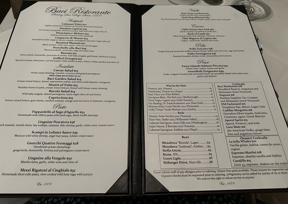 Introducing the menu at Baci Restaurant, a seafood - Italian gem located in San Diego, CA, known for its classy and quiet ambiance. The menu offers a wide range of options, from Antipasti like Insalata Caprese and Steamed Mussels, to flavorful Primi dishes such as Linguine alle Vongole and Gnocchi Aurora. Customers rave about the delicious food, outstanding service, and cozy atmosphere. With options like the veal parm, swordfish, and gluten-free pasta, Baci Restaurant is a favorite among locals and visitors alike. The traditional family-owned restaurant also hosts wine pairing dinners and offers a full bar with perfect drink options. You can indulge in appetizers like calamari and finish your meal with delectable desserts like cannolis. Overall, Baci Restaurant provides a delightful dining experience that will leave you feeling satisfied and wanting to return for more.